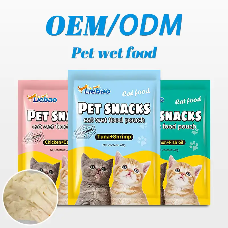 Product Introduction: This is a customizable pet wet food pouch designed for daily feeding, nutritional supplementation, and digestive health. It has a soft, chewy texture, is highly moist, and extremely palatable, helping to replenish your pet's daily hydration needs, nourish their digestive system, and maintain their health. This product is ideal for wholesale, retail, and private label businesses. Flavors, packaging, formula, and sizes can all be customized to your market needs.